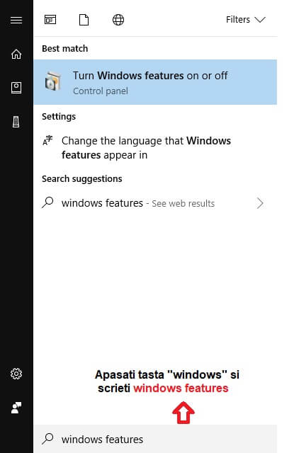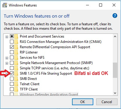 Accesati meniul START si tastati “Windows features”. Accesati si activati functia “SMB1.0/CIFS File Sharing Support”.