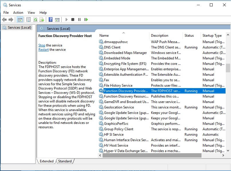 - Din “Services” activati functiile “Function Discovery Provider Host” si “Function Discovery Resource Publication”